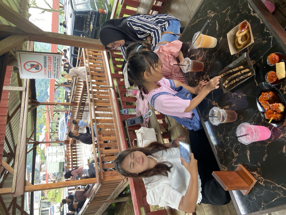 - "A group of people, including a young girl in a pink top and overalls, are seated at a dark marble-patterned table at an outdoor restaurant" by FM-htxI33, licensed under CC BY 4.0