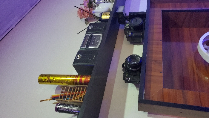 The scene depicts an interior space in Jos, Nigeria, featuring two dark-colored wall-mounted shelves against a light-colored wall. On the upper shelf, from left to right, are a dark cylindrical container labeled "ACTIVATED SLUDGE," a wooden pencil holder containing several colored pencils, a tall golden celebratory popper or decorative tube with red patterns, a black and silver NAKAi compact stereo system, a small vase holding pink artificial flowers, a gold-labeled reed diffuser, and a white ribbed vase. The lower shelf displays two black digital single-lens reflex (DSLR) cameras; the camera on the right is equipped with an external flash unit. The upper portion of the image reveals a ceiling and wall area illuminated by a purple light source, casting a distinct hue over the environment. Below the lower shelf, a section of a wooden furniture piece with dark trim is visible. No individuals or dynamic actions are present.