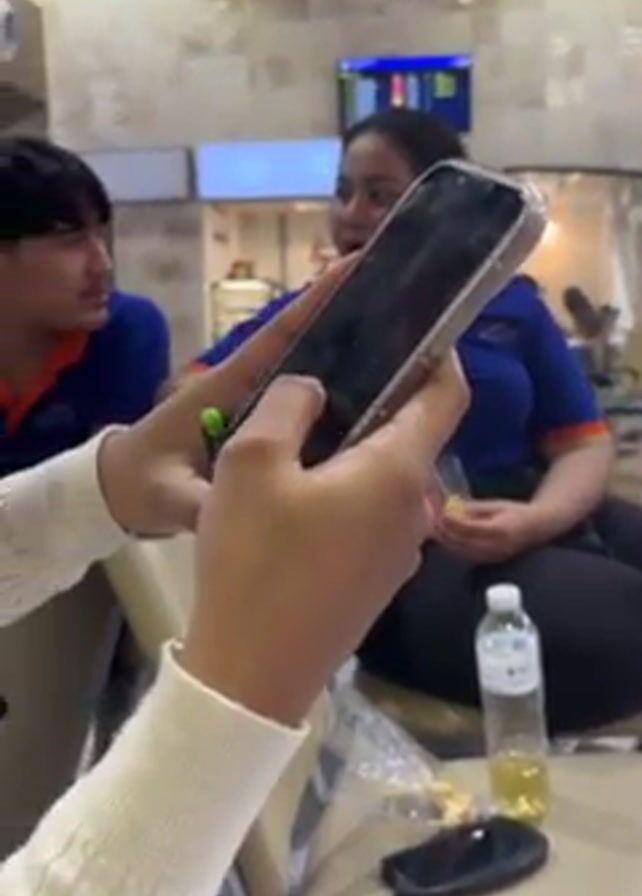 A woman in a white sweater holds a smartphone and looks at the screen, then looks at a man in a blue and orange polo shirt. The man is sitting near another person wearing the same type of shirt. The woman with the phone is seated, and there is a water bottle, a pen, and what appears to be a set of car keys on the chair next to her. The scene appears to be taking place indoors, possibly in an airport waiting area, with tile flooring and a high ceiling. A digital display and service counters are visible in the background.