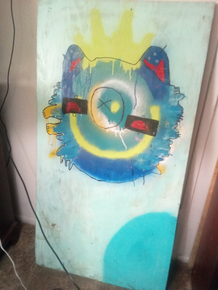 A vertically oriented, painted wooden panel, approximately door-sized, displays a multi-color graffiti-style artwork. The artwork features a stylized, blue and yellow character with a jagged yellow crown, two rectangular black and red 'eyes,' a central yellow spray-painted circle, and two yellow paw-like appendages on the left. Black outlines and paint drips are visible. A separate, large turquoise spray-painted semi-circle occupies the lower right section of the panel. The panel is positioned indoors, leaning against a light-colored wall, and rests on a light-colored floor. A dark brown furniture item is partially visible on the left, and a lighter brown vertical object is on the far right. Black and white electrical cables traverse the lower-left foreground. No specific identifying features within the image indicate a precise location within the city of Los Angeles, United States.