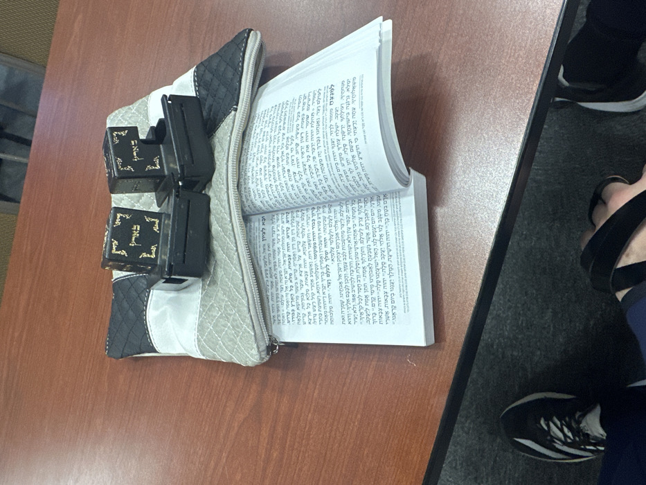 On a reddish-brown wooden table in Medford, United States, a pair of black tefillin are positioned on a multi-paneled pouch, colored black, white, and a light textured gray/beige. The pouch is partially unzipped and rests on an open white prayer book, displaying Hebrew text across both visible pages. The book's spine is oriented towards the viewer. Below the table, a dark gray carpeted floor is visible. Two feet, likely belonging to the same individual, are partially visible. The left foot wears a black and white athletic shoe, while the right foot wears a dark-colored sandal. No other individuals or actions are depicted.