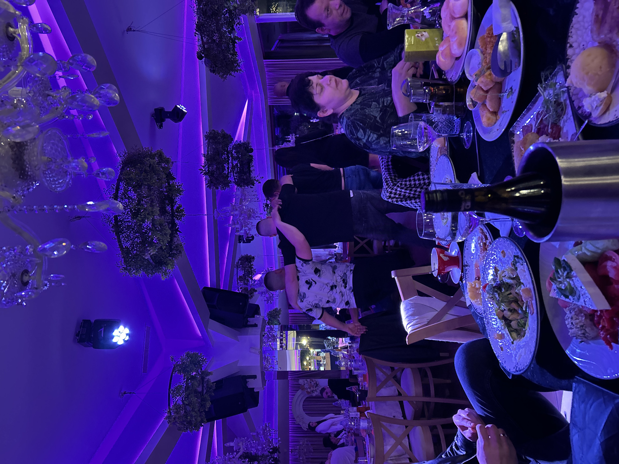 The scene depicts a restaurant interior, likely in Blagoevgrad, Bulgaria, given the user's request. Several individuals are seated at tables, seemingly engaged in conversation or dining. The lighting is predominantly purple, creating a distinct ambiance. On the ceiling, decorative elements such as artificial foliage and chandelier-like fixtures are visible, along with stage lighting equipment. The tables are set with plates of food, glasses, and a wine bottle chilling in a container. The restaurant's interior features vertical architectural panels in shades of purple and white. People are seated at tables and appear to be dining and socializing. A man is standing with his back toward the viewer and appears to be greeting someone. The tables have food, drinks, and other objects associated with a meal.
