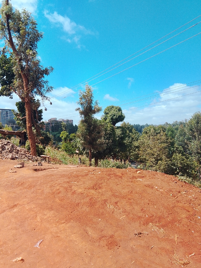 The scene in Karingani ward, Kenya, depicts an outdoor environment under a bright blue sky with scattered white clouds. The foreground consists of reddish-brown, uneven earth with minimal dry vegetation and a visible piece of white litter. To the left, a mature tree with a thick brown trunk stands near a pile of rocks and a simple wooden bench. Across the mid-ground, a dense canopy of various green trees and undergrowth dominates, including a tall, slender conifer-like tree and a bushy round-crowned tree. In the upper left background, multiple modern multi-story buildings are visible on elevated terrain. Three parallel overhead wires, possibly power or communication lines, traverse the upper sky from left to right. No people or animals are present.