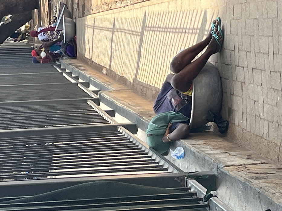This image captures an outdoor urban scene in Accra, Ghana, likely near a major market or transport hub such as the Agbogbloshie or Makola market vicinity. A person is observed resting within a large, silver-colored metal basin, positioned on a concrete ledge. This individual wears a dark blue t-shirt with a graphic and yellow shorts, with a light green cloth covering their head and face. Light blue flip-flops adorn their feet. A clear plastic bottle and a black plastic bag are visible near the resting person. A tall, dark grey metal fence with vertical bars runs along the left, parallel to the concrete ledge. Further along this ledge, multiple other individuals are also resting, some alongside similar metal basins. The ground consists of reddish-brown brick pavement, strongly illuminated by sunlight that casts prominent striped shadows from the fence. Distant foliage is visible in the background.