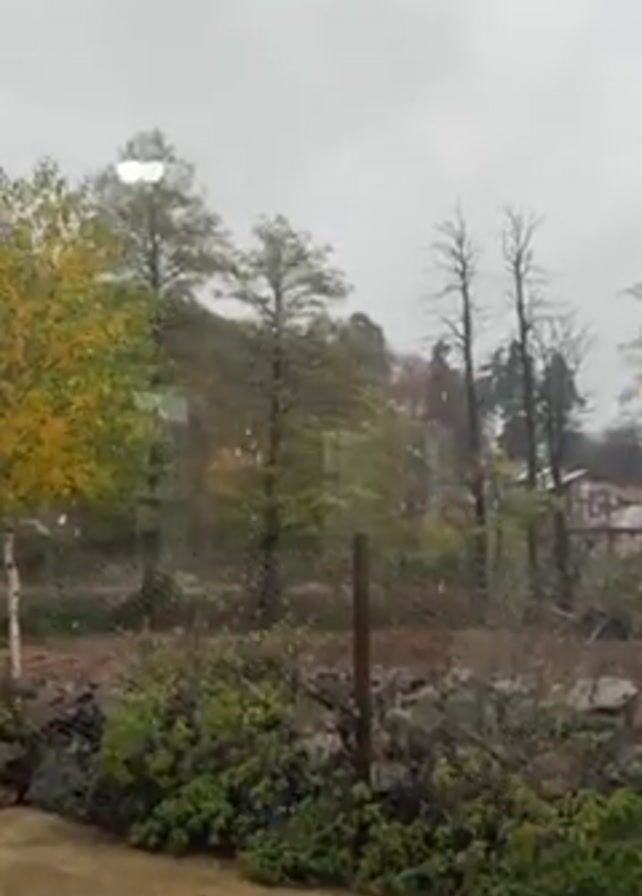The view from inside a building looks through a window at a rainy or snowy outdoors scene. In the foreground is a wet surface with some plants and small rocks, separated by a chicken wire fence. In the background are trees, some with green leaves, one with yellow, and some bare. Beyond the trees are building or houses with roofs visible. A loud noise can be heard which sounds like thunder.