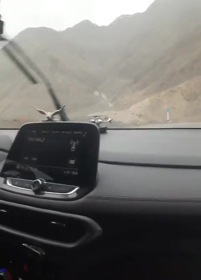The view from inside a moving car shows a mountain landscape on a rainy day