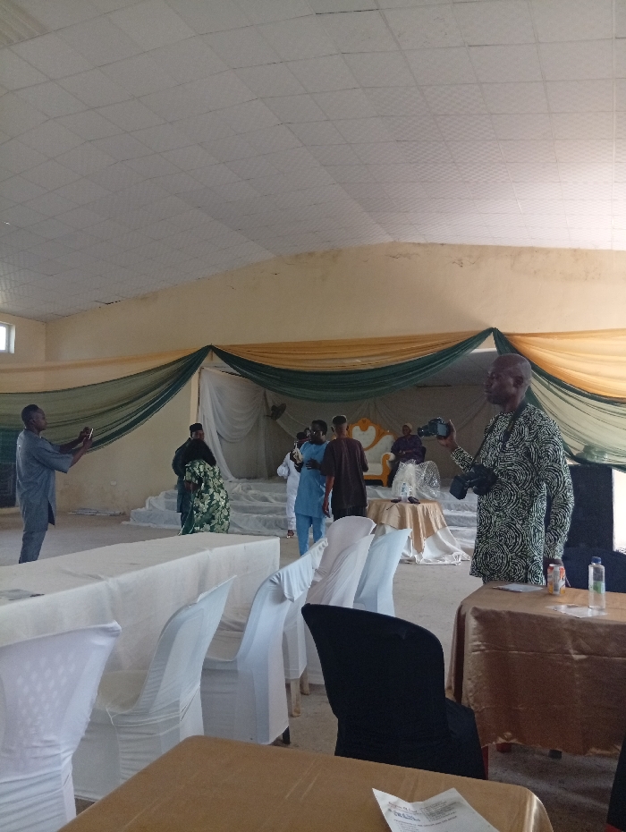 The scene depicts an indoor event occurring in a large hall or event space within the city of Unknown, Unknown. The ceiling features white acoustic tiles, some exhibiting discoloration or damage. The light beige walls show visible staining and marks, particularly near the ceiling. The flooring appears to be light-colored concrete or tiled. In the background, a raised stage area is decorated with draped green and yellow/gold fabric swags. On the stage, an individual in dark attire is seated in an ornate gold armchair positioned behind a small table covered with a white cloth. Several other individuals are present on and around the stage. One person to the left of the stage wears a dark green patterned dress and headwrap. Other individuals in the stage vicinity, primarily men, are dressed in tunics and traditional garments. In the midground, a man on the right wears a patterned dark green and black long-sleeved shirt and holds a professional camera, complete with an attached external flash or microphone, pointed towards the stage. To the left, another man in a light-colored tunic holds a smartphone horizontally, seemingly capturing the scene towards the stage. The foreground contains multiple rectangular tables, some covered with white and others with gold tablecloths. Chairs with white and black slipcovers are arranged around these tables. A plastic water bottle and a small beverage can are visible on a gold-covered table in the mid-right foreground. A printed document rests on a table in the extreme foreground.