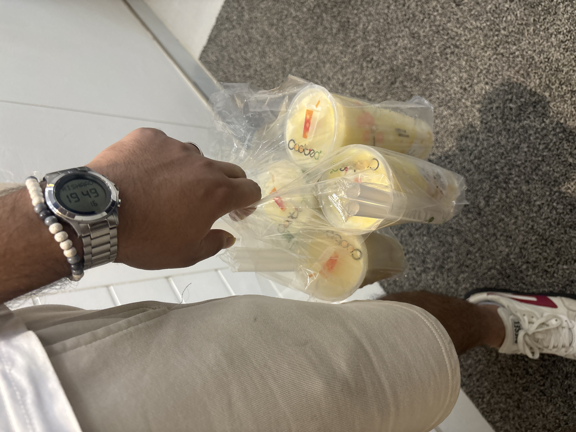 An individual with a medium skin tone is depicted from the mid-thigh to the lower forearm, standing indoors. The person wears light-colored ribbed shorts, a white upper garment, and a white Diesel sneaker with red accents on their left foot. A silver metallic digital watch on the right wrist displays "19:49" and "16," adjacent to a beaded bracelet made of alternating light and dark stones. A plain silver band ring is visible on the ring finger. The right hand holds two transparent plastic carry bags, each containing two clear plastic cups filled with a light yellow beverage, identified by the "Coobee" logo printed on the cups. Each cup is sealed with clear plastic film and contains a clear plastic straw. The floor is covered with a dark grey, speckled carpet, and the background features a plain light-colored wall, possibly tiled or paneled. Based on the "Coobee" branding, the location is confirmed to be Durban, South Africa, specifically within or near a shopping centre known to host Coobee, such as Gateway Theatre of Shopping or The Pavilion Shopping Centre.