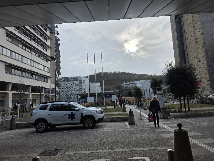 - "The image displays a daytime view of a modern hospital campus in Rouen, France, framed from beneath a wide, light-colored architectural overhang" by FM-PPRef1, licensed under CC BY 4.0