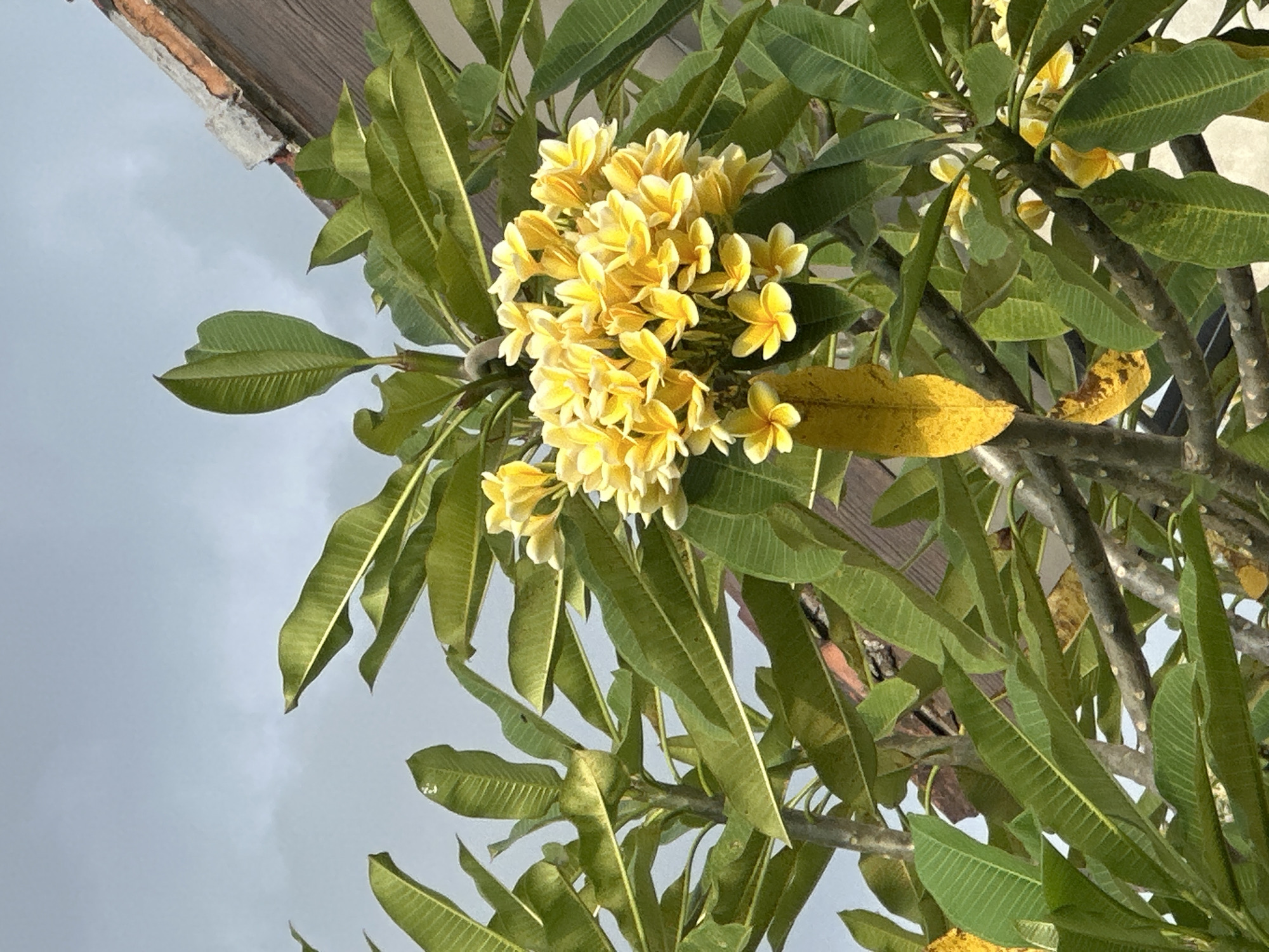 An upward-angled photograph depicts a vibrant cluster of yellow Frangipani (Plumeria) flowers, surrounded by numerous green leaves and visible branches of the tree, situated in Buduk, Indonesia. The flowers feature five petals each, with white centers transitioning to bright yellow edges, forming a dense spherical inflorescence near the upper center of the frame. Several broad, oblong green leaves are prominent, some exhibiting lighter green veins or slight yellowing. Below the main flower cluster, one distinctly yellowed leaf hangs vertically. The background consists of a light gray-blue sky, indicating an overcast or partly cloudy day. In the upper right quadrant, a section of a building's roof is visible, characterized by weathered, reddish-brown terracotta tiles and exposed, cracked concrete or plaster along its edge. No people, discernible actions, or interactions are present in the scene.