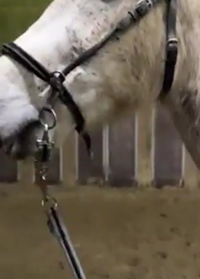 close-up of a white horse standing in an indoor riding arena. The horse is wearing a black bridle and a lead rope is attached. The arena has sand on the ground and the walls are painted green and white. The horse looks calm and relaxed. The camera angle is low, looking up at the horse.