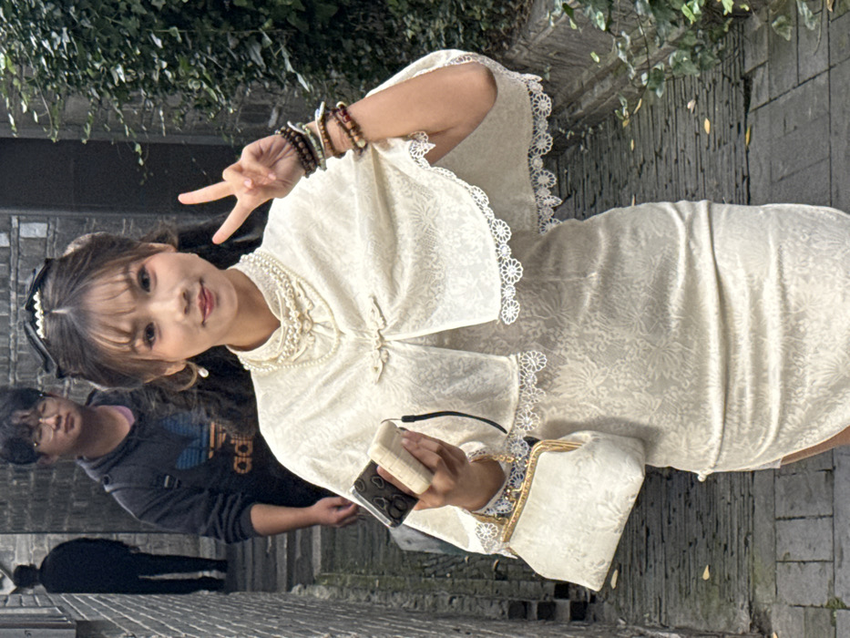 A young East Asian female stands centrally in a narrow stone alleyway in Qinhuai District, China. She is oriented towards the viewer, smiling, and performing a peace sign with her raised right hand. She wears a cream-colored, high-collared, embroidered cheongsam-style dress with a sleeveless underlayer and a matching short cape, both trimmed with white scalloped lace. Her accessories include multiple strands of pearl necklaces, pearl drop earrings, a pearl-embellished dark headband, and numerous multi-colored beaded bracelets on her left wrist. In her left hand, she holds a smartphone in a clear case, a small beige electronic device, and a cream-colored, gold-framed purse with a short chain handle. Behind her, in the mid-ground, an East Asian male with glasses and a dark Adidas hoodie looks towards the viewer. Further back, a second male figure is visible in silhouette, walking away down the receding alley. The alley walls are constructed from grey stone blocks, and the ground is paved with irregular stone blocks. Green foliage, possibly ivy, grows along the right wall.