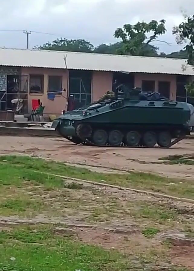 A green military vehicle with six wheels on each side is moving to the right on a dirt road. There is a building behind the vehicle. Clothes are hanging on a line in front of the building. There is green grass in the foreground. The sky is gray.
