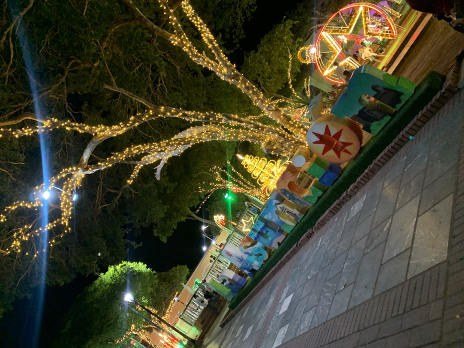 A nighttime scene captures trees adorned with strings of twinkling lights. Further down, there's a colorful display featuring festive decorations and a Ferris wheel illuminated with lights. The foreground shows a patterned stone walkway. The image is slightly tilted, giving a unique perspective of the vibrant holiday ambiance.