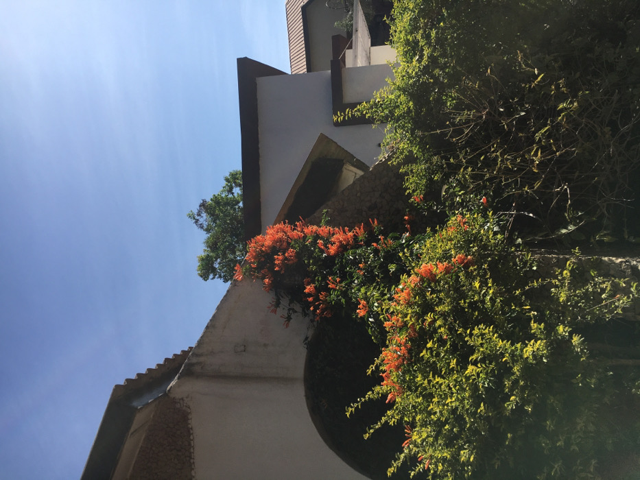 The image depicts an outdoor scene in Jos, Nigeria, characterized by architectural elements and dense vegetation under a clear, light blue sky. In the foreground and midground, a vibrant orange flowering vine, likely a Flame Vine, grows vertically along and over a textured, light-colored wall with a distinctive stepped roofline on the left. Below and around this, a lush, bright green bush or hedge occupies the lower portion of the frame. An arched architectural feature is partially visible behind the foliage on the left. To the right, another white building with a dark, flat roof section is present, featuring a dark, angled architectural projection. Further in the background, a reddish-brown tiled roof is discernible. No individuals are visible in the scene. The bright sunlight suggests daytime, illuminating the plants and structures.