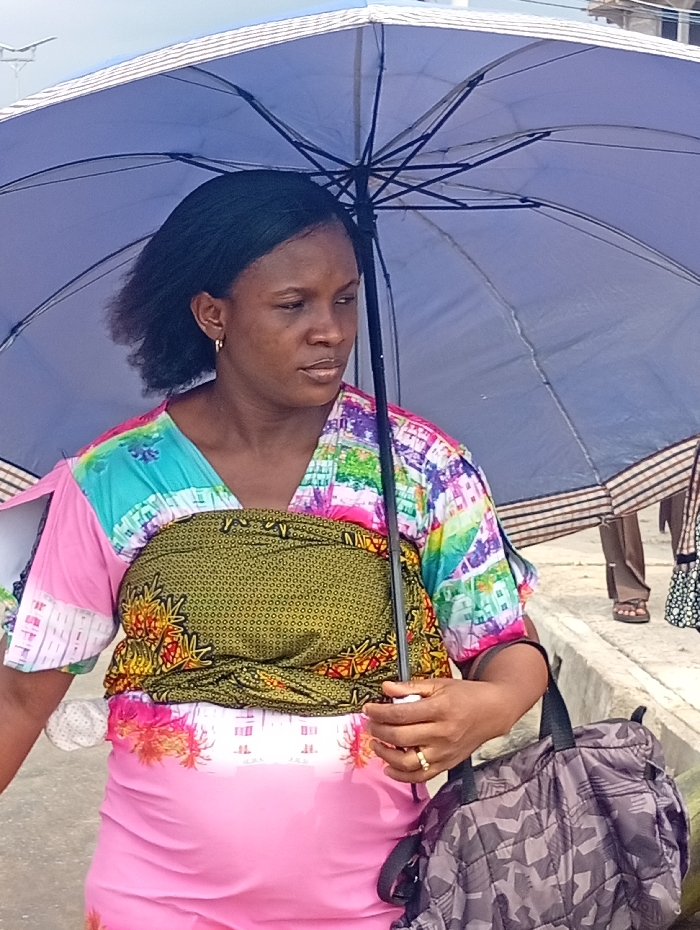 An adult female is depicted standing outdoors in Aba, Nigeria, holding a light blue umbrella