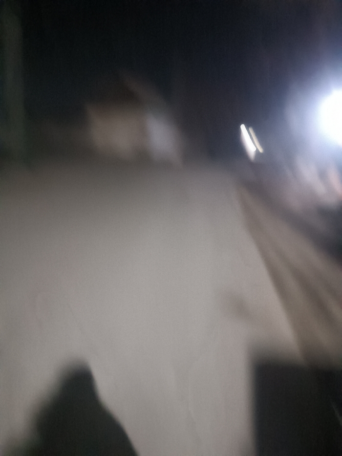 A blurry, low-light image shows a light-colored wall as the primary focus. The top of the frame reveals a dark background with indistinct shapes, possibly buildings. A bright light source is visible on the right side. A dark, indistinct shadow appears in the lower-left corner, and another dark object or shadow is present in the lower-right. The image lacks clarity and sharpness.