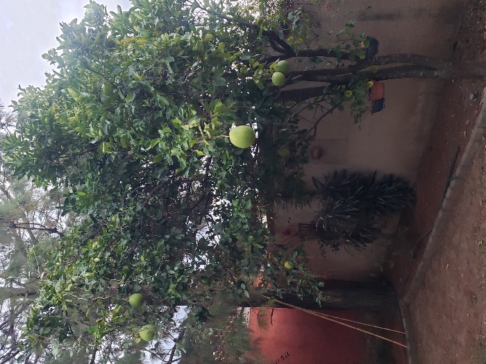A tree laden with large, green fruit stands in a yard. The tree's canopy is dense with leaves, and several fruits are prominently visible. Behind the tree is a tan wall, partially obscured by greenery. The ground is a mix of brown soil and paved surfaces. Other plants and trees are scattered around. A section of a red wall is visible at the bottom of the scene. Overall, the setting is a residential backyard or garden.
