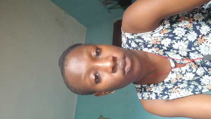 A single adult female subject is depicted in a frontal, chest-up image, situated indoors in the city of Unknown, Unknown. The subject has dark skin, with dark hair pulled back, appearing to be covered by a dark cap or net. Small, circular, light-toned hoop earrings are present in both ears. She wears a sleeveless dark blue top patterned with white and light orange floral designs. A red cord necklace, from which a dark, oblong pendant hangs, is visible on her chest. The subject maintains a neutral facial expression, looking directly into the camera. The immediate background consists of a light blue-green painted wall and a light-colored ceiling. A light-toned, cross-shaped object is partially visible on the wall to the subject's upper left. Darker discolorations or stains are present on the wall, particularly in the upper right quadrant of the image. Additional items, possibly fabric or bags, are partially visible hanging on the wall to the subject's right. The scene is evenly lit by ambient light.