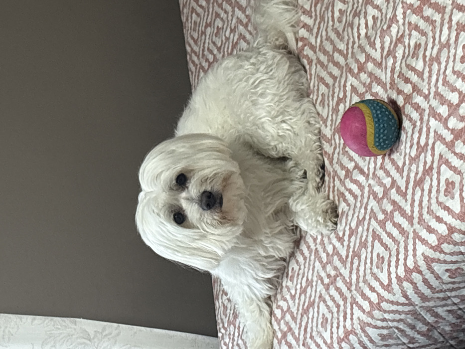 This image depicts an indoor scene in Córdoba, Spain, featuring a white, long-haired dog positioned centrally on a bed. The dog, consistent with a Maltese or similar breed, lies with its front paws tucked, facing the camera directly. Its dark eyes are visible through its shaggy facial hair, and it exhibits a dark nose. To the lower right of the dog, a small, multi-colored play ball, segmented in pink, yellow, and textured blue, rests on the bedding. The bedding is a quilt or blanket displaying a repeating white and reddish-pink geometric pattern. The background consists of a solid dark brown wall or headboard, with a partial view of a white patterned curtain or fabric strip visible on the far left. No other individuals are present.