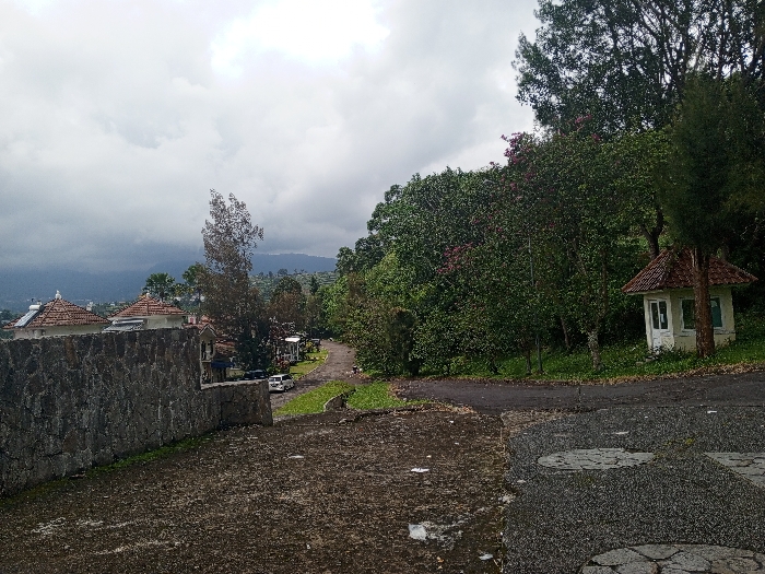 A landscape shot under a cloudy sky shows a stone wall in the foreground, beyond which are houses with tiled roofs. A road winds through lush green trees and bushes. A small white structure with a tiled roof is nestled among the trees. Mountains are faintly visible in the distance, adding depth to the scene. The pavement in the foreground is a mix of concrete and stone patterns.