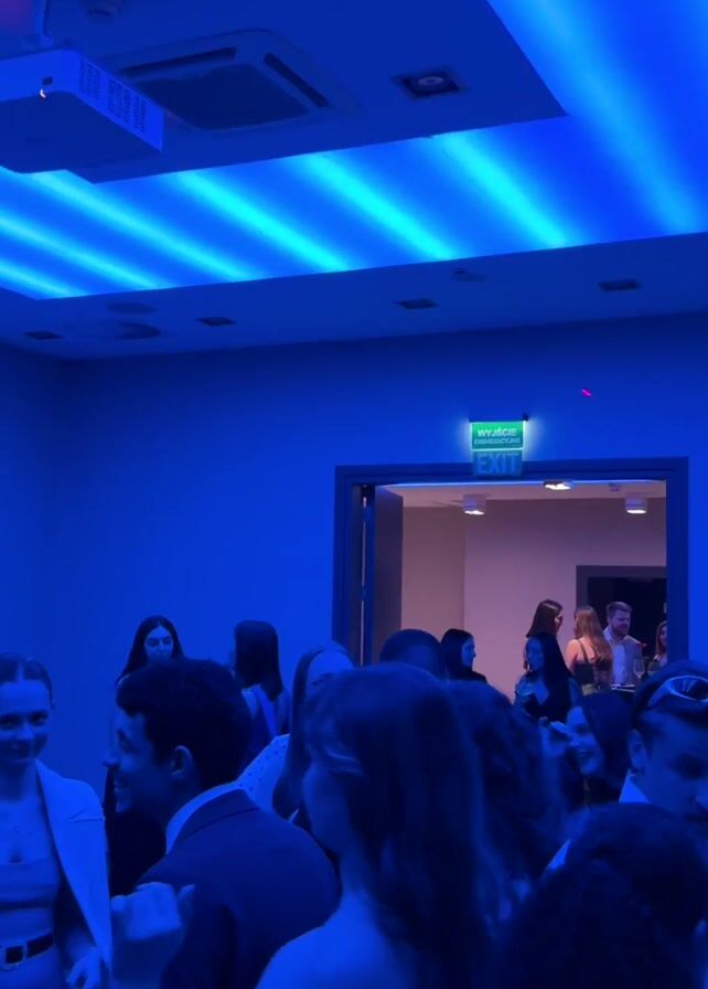 group of young people dancing and socializing in a room lit with bright blue lights. The room appears to be a venue space, with a projector mounted on the ceiling and an illuminated "EXIT" sign over a doorway. Most of the people are wearing formal attire, suggesting the event is a prom or similar formal gathering. They are smiling, laughing, and dancing, creating an atmosphere of celebration and enjoyment. The camera moves slightly, capturing different angles of the crowd and the overall scene.