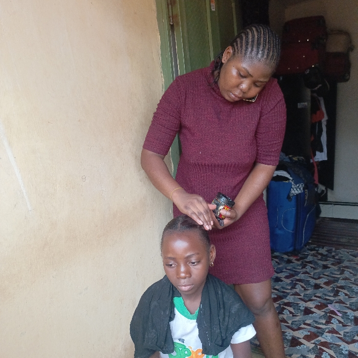 The image depicts an indoor scene in Akwanga, Nigeria, featuring two females. An adult female, with cornrow-braided hair and wearing a ribbed, burgundy short-sleeved dress, stands to the right. She holds a smartphone to her left ear, indicative of being on a call, and her right hand is placed on the head of a younger female. Her left hand holds a small, dark-colored container, consistent with hair care product packaging, near the younger female's head. The adult female has a gold-colored earring in her left ear and a thin gold-colored bracelet on her left wrist. The younger female, appearing to be a child or pre-teen, is seated or kneeling in front of the adult, facing slightly away from the camera with her head lowered. Her short, dark hair is being attended to. She wears a white t-shirt with green graphic elements and has a black fabric draped over her shoulders. A small gold-colored hoop earring is visible in her left ear. The background consists of a light brown, textured wall on the left. To the right, a dark doorway with a dark green frame reveals a cluttered space beyond, containing items resembling luggage or storage bags, including a prominent blue suitcase and a reddish-brown bag. The floor is covered by a patterned rug or mat featuring geometric designs in shades of blue, white, and possibly pink/red.