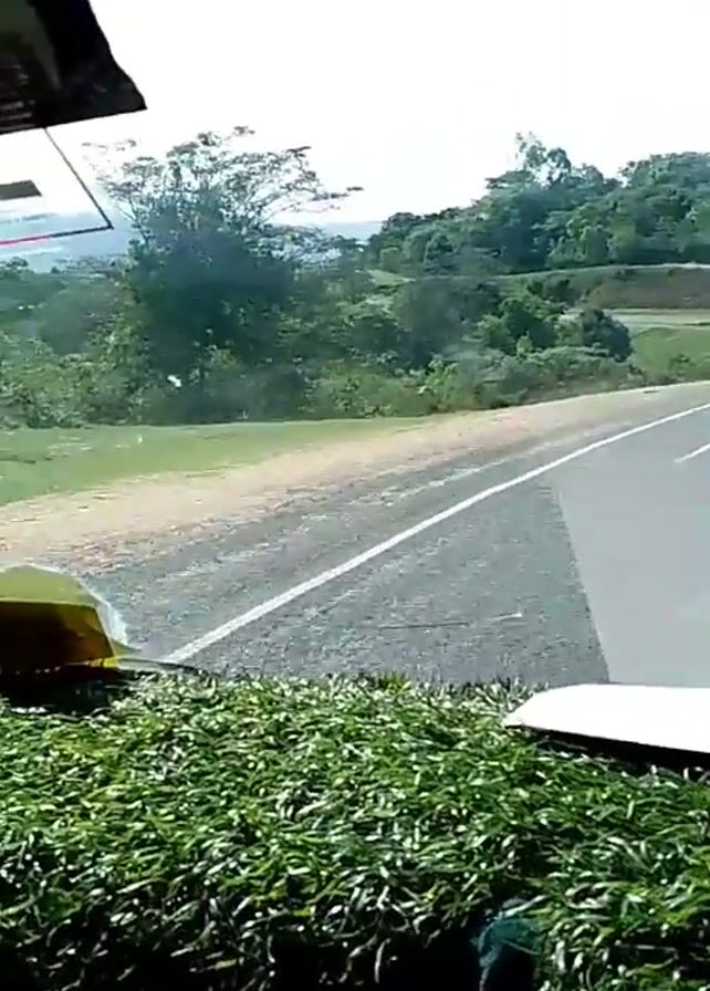 winding road from the perspective of a vehicle’s dashboard. Lush green foliage is visible along the bottom of the frame, partially obscuring the lower part of the windshield. Beyond the road, a grassy slope leads up to a dense forest, which blankets the rolling hills in the distance. The road itself is asphalt with faded lane markings and is bordered by a guardrail on the outside edge of the curve. The camera seems to be located within the vehicle with a view facing forward.