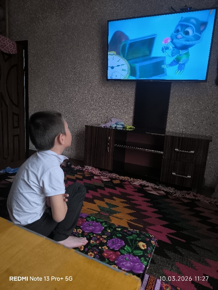 The image depicts an indoor residential scene in Pakhtakor, Uzbekistan. A young, barefoot child, wearing a light-colored short-sleeved polo shirt and dark trousers, is seated on the floor, facing a wall-mounted television screen. The child's back and left profile are visible as they look upwards towards the screen. The television displays an animated scene featuring a blue, anthropomorphic character, a treasure chest, and a pocket watch. Below the television, a dark wood-grained entertainment unit with cabinets and open shelving is situated against a textured, light-brown wall. Several folded cloths are visible on top of the entertainment unit. The floor is covered by a multi-colored geometric patterned rug in shades of black, maroon, orange, and yellow. A cushion with a floral pattern, predominantly purple, rests on the rug in the foreground. A dark wooden door is partially visible on the left side of the frame. The image was captured on 10.03.2026 at 11:27 using a REDMI Note 13 Pro+ 5G device.