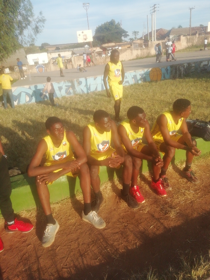The image depicts an outdoor basketball court scene, located in Jos, Nigeria, under clear, sunny daylight conditions
