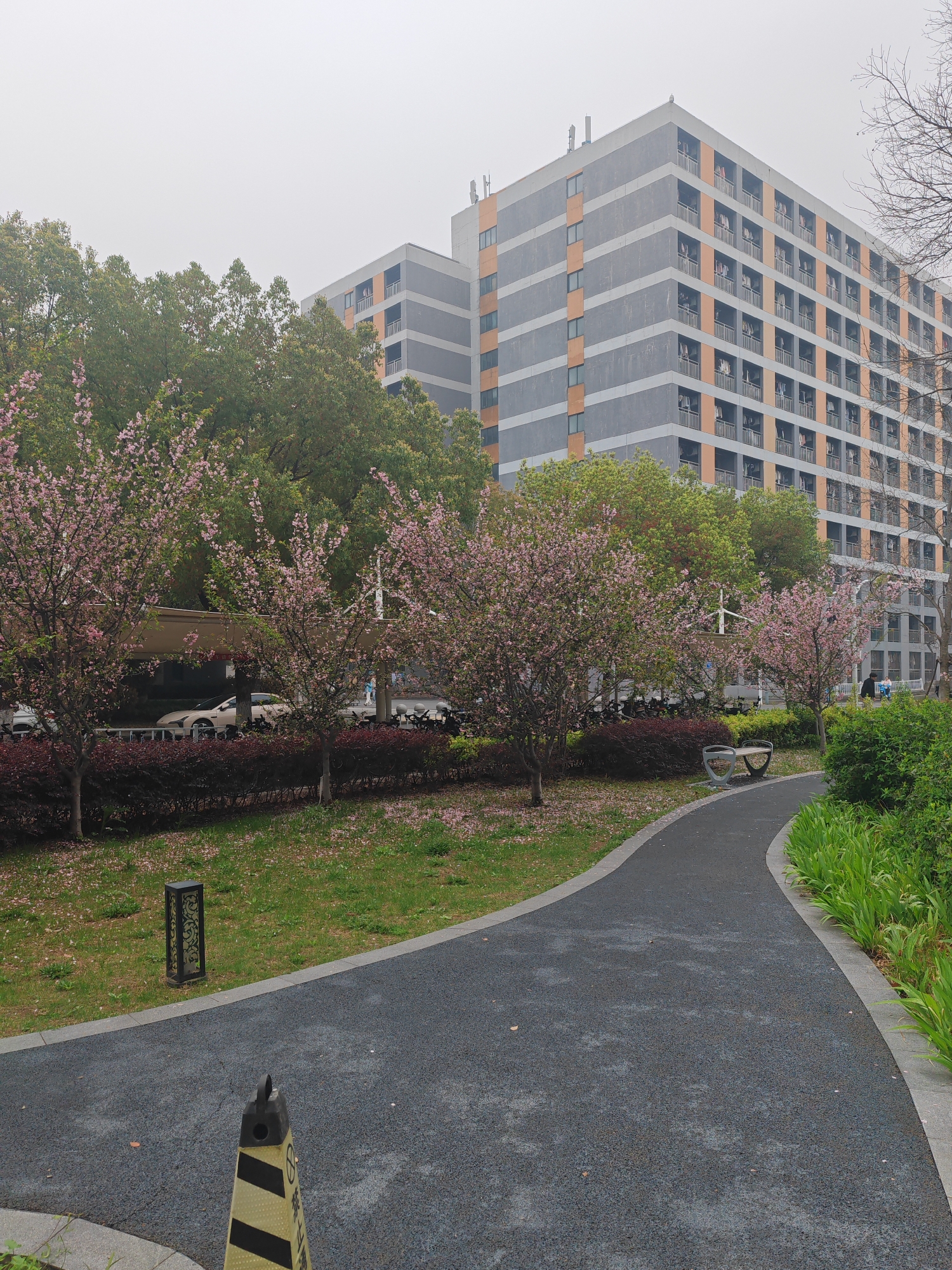 The image depicts an outdoor scene in the Jiangning District of China. A curving dark gray paved pathway is bordered by green grass and vegetation on either side. In the background, large buildings with gray and orange facades stand behind a row of trees with pink blossoms. There is also a shrub bed. Cars are parked on a street behind the shrub bed. A bench is situated by the path. A traffic cone is visible on the edge of the walkway and a decorative metal outdoor lamp post stands on the grass. The sky is overcast.