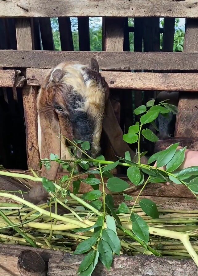 A goat is eating green vegetation inside of a weathered wooden cage. The goat has a cream-colored head, brown ears, and a black stripe down the middle of its face. There are green branches with leaves, as well as piles of cut green plant stems, in front of the goat in the cage. A person’s hand is feeding the goat the green vegetation. A small, black goat can be seen in the back of the cage, behind the brown goat. The light blue sky can be seen in the background behind the cage.