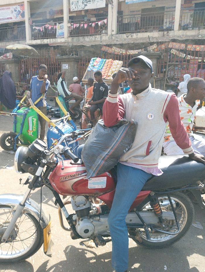 The image depicts a bustling outdoor urban market scene in Kubwa, Nigeria, observed under bright daylight conditions. In the immediate foreground, a dark-complexioned male, wearing a grey baseball cap, a grey and maroon zip-up jacket, and blue trousers, is seated astride a red Bajaj Boxer motorcycle. His right hand is raised, with fingers touching his forehead, and he is looking directly towards the camera. A black, coarse-woven bag rests on the motorcycle's fuel tank. Behind the primary subject, the scene is active with multiple individuals and market elements. To the left, a male in a blue t-shirt stands near a green and yellow two-wheeled pushcart, which holds large blue containers and is labeled "POWER." Further back and slightly to the right, another male in a black t-shirt bearing the number "109" is seated. Other indistinct figures are visible throughout the midground. The background is dominated by a multi-story concrete commercial building with balconies lined with railings, from which pink fabric streamers are hung. Partial signage on the building includes "ALBADA GLOBAL" and "PEDAM CLINIC." Directly in front of this building, a market stall or display rack exhibits numerous packaged goods, such as snacks or candies. The ground surface appears to be rough asphalt or compacted earth, with visible shadows indicating bright sunlight.
