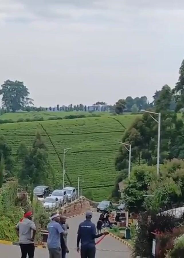 The video depicts a scene in a hilly area with lush greenery, likely a tea plantation or a similar agricultural landscape