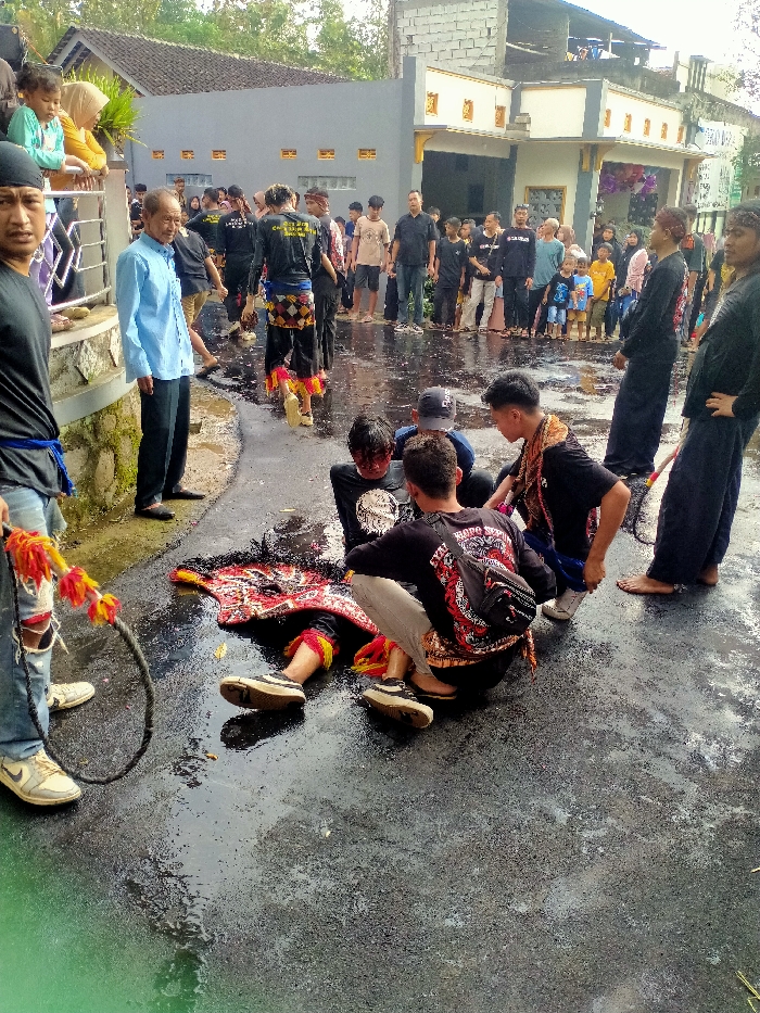 A cultural event takes place on a wet asphalt road. Performers, clad in traditional black attire and colorful accents, stand among a crowd of onlookers. Some wear headbands. One figure lies prone on the ground, surrounded by concerned individuals. Buildings form the backdrop, with children watching from behind a wall. A man holds a braided whip. The atmosphere suggests a combination of ritual and community engagement.