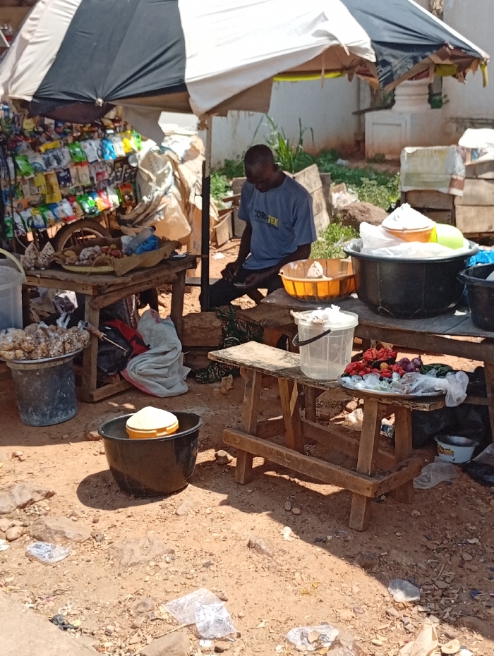 This image captures an outdoor market scene in Lokoja, Nigeria, under bright daylight