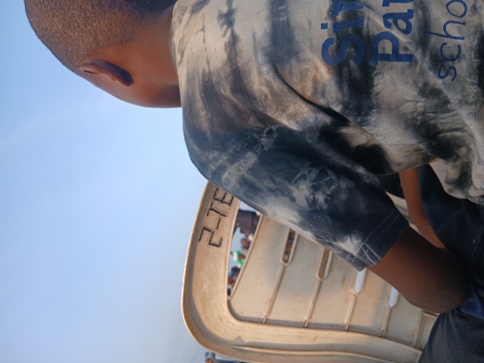 A young person with a short haircut is viewed from behind and to the side. They are seated in a beige plastic chair with the inscription "2-TE". The person is wearing a tie-dye shirt with blue text that reads "Si School". The background consists of a clear blue sky.