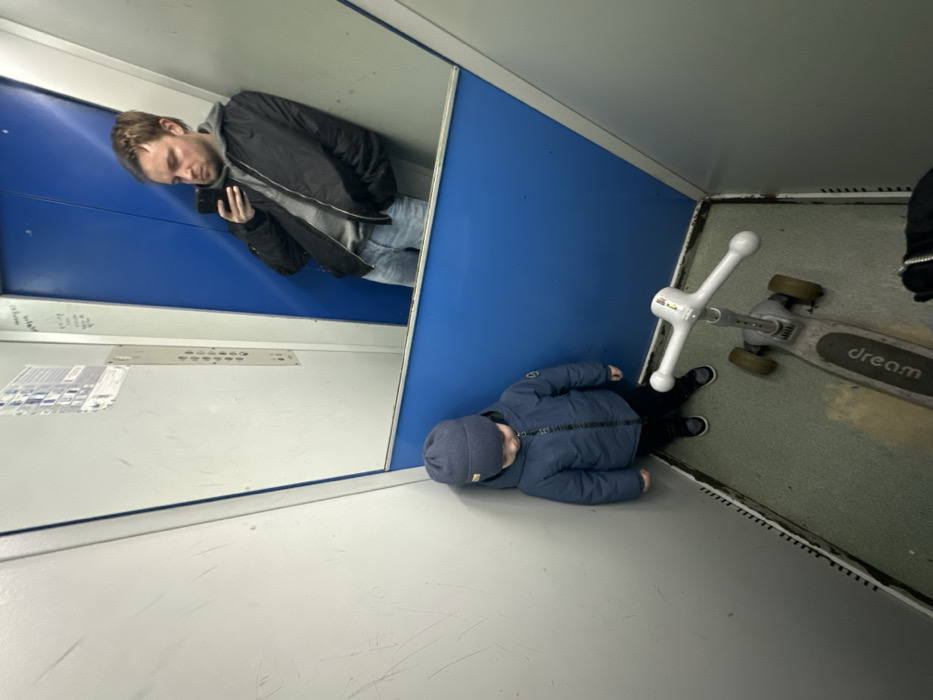 This image depicts the interior of a utilitarian elevator located in Khimki, Russia. An adult male is visible in a large mirror occupying the upper rear wall, actively holding a black smartphone to take a selfie. He wears a black bomber jacket over a grey hooded sweatshirt and light blue jeans. Below the mirror, a blue panel extends across the elevator's width. To the left, a small child stands in the corner, facing partially away from the camera and looking downwards. The child is dressed in a navy blue beanie, a navy blue puffer jacket, dark pants, and dark shoes. On the greenish-grey floor, between the child and the camera's perspective, lies a grey three-wheeled scooter with "dream" visible on its deck. The elevator's side walls are light grey, exhibiting numerous scratches and minor graffiti. A vertical control panel featuring a row of silver buttons is partially visible on the right wall, within the reflection. The elevator doors, seen reflected, are blue.