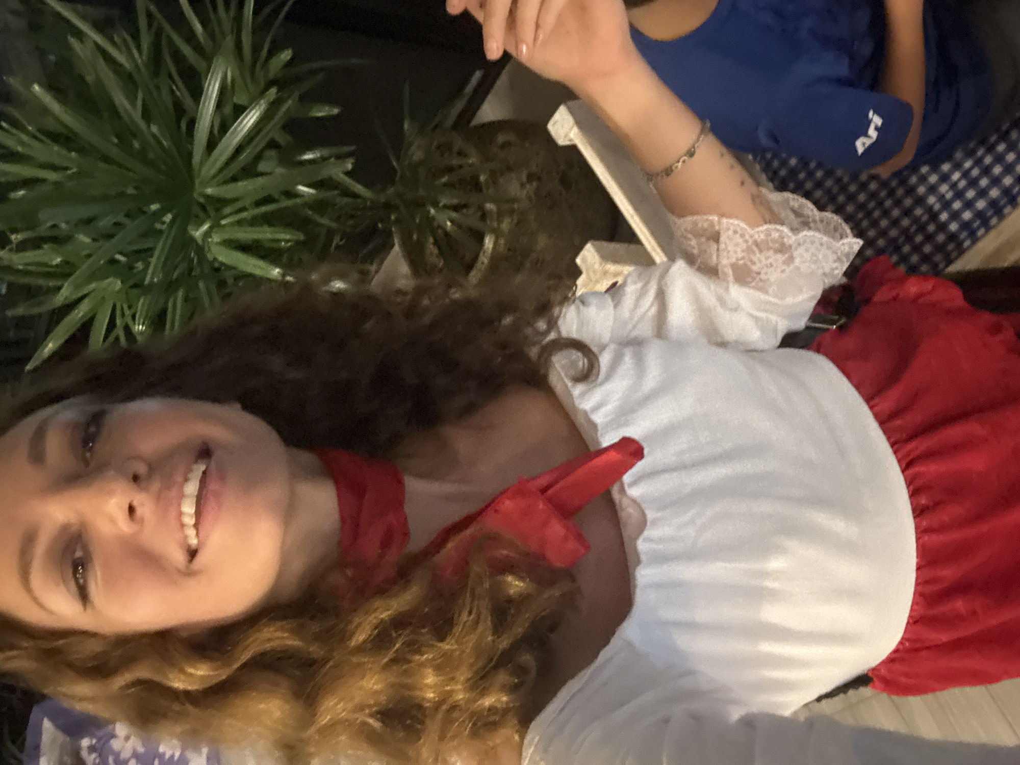 The image captures an adult female and a partially visible individual in Baan Plai Laem, Thailand, under low-light conditions. The primary subject, an adult female with long, wavy, light brown hair, occupies the foreground, smiling with teeth exposed. She is attired in a white, wide-necked blouse with lace cuffs, a red neckerchief, and a red lower garment. A thin, beaded bracelet is visible on her left wrist. Her left hand is raised near the right shoulder area of a second, partially visible individual on the lower right. This individual wears a blue short-sleeved shirt with "Ari" printed in white on the sleeve. In the upper right background, a large potted plant with long green leaves is present, positioned behind a low, white structural element. A blue and white checkered pattern is visible on a surface in the lower right corner.