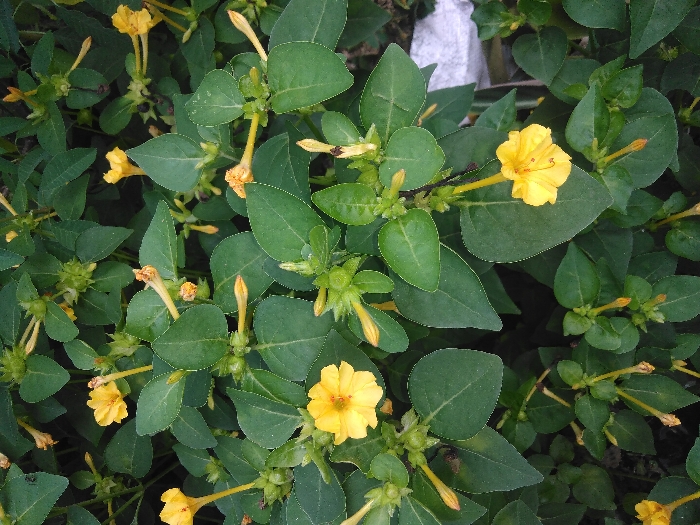A close-up vertical image displays a dense cluster of a flowering plant located in El Nayar, Mexico. The plant features numerous dark green, ovate to cordate leaves interspersed with multiple bright yellow, trumpet-shaped flowers. Several flowers are fully open, exhibiting visible orange stamens, while others are present as elongated, yellow-orange closed buds. Some flowers appear in various states of senescence or partial closure. The background consists primarily of additional foliage, with a small, indistinct light-colored object partially visible on the far right edge of the frame. No human subjects, animals, or specific actions are depicted.