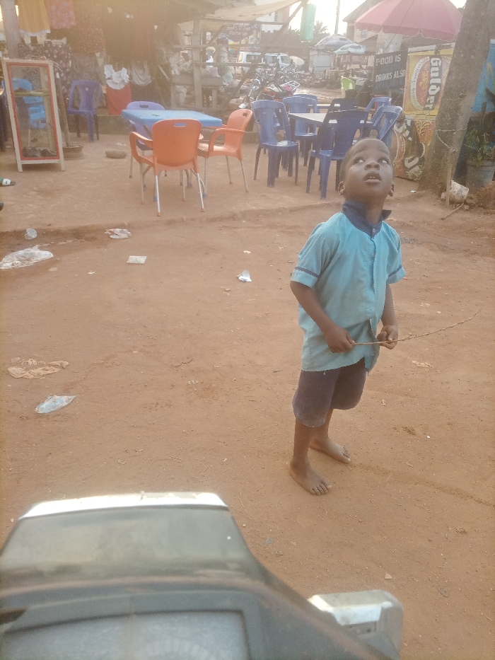 A young boy in a light blue collared shirt and dark shorts stands barefoot on a reddish-brown dirt ground. He gazes upward, holding a thin stick in his hands. In the background, tables and chairs are scattered around an outdoor area, suggesting a market or small business. A partially visible vehicle is in the foreground, obscuring the lower portion of the view.