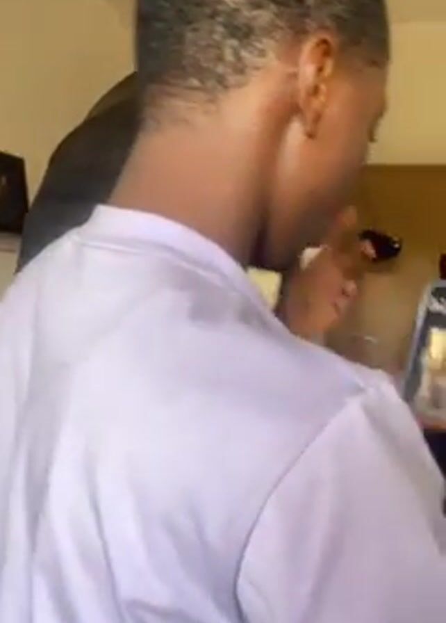 A person in a light purple shirt takes a photo of a woman wearing a black suit with a white shirt and tie, who is holding a phone to her ear. The woman is standing in front of a beige backdrop in what appears to be a photography studio with lighting equipment visible. The person with the phone in hand looks at the screen. There is also a picture frame on a shelf visible at the beginning of the video.