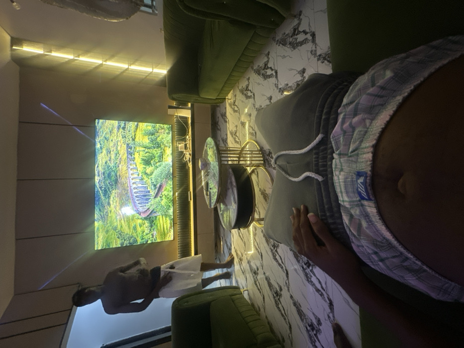 n indoor living space with marble floors and a TV displaying a winding staircase in a lush green landscape. A man is seen standing in front of the TV, partially obscured, wearing a towel. In the foreground, a person is visible, sitting on a grey cushion with patterned shorts, possibly observing the scene. Green sofas are arranged around the space. A modern, multi-tiered glass coffee table is situated between the person and the TV.