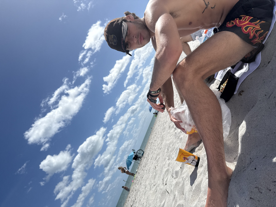 A shirtless man in a baseball cap and shorts sits on a sunny beach. He holds a clear plastic bag. Beside him is a container of food and a towel. In the background, a bicycle, an umbrella, and a few distant people are visible. The sky is bright blue with puffy white clouds. The camera angle is tilted.