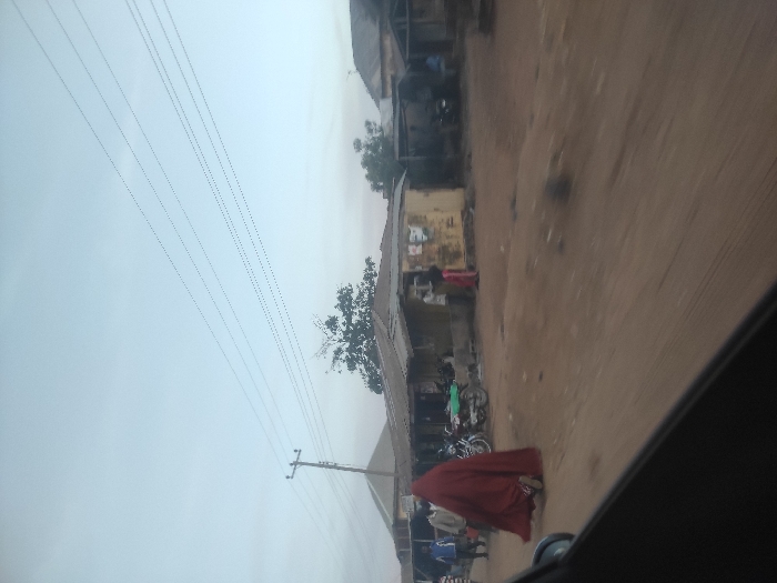 A street scene reveals a dirt road lined with simple buildings. Some structures appear to be shops or stalls, with people visible nearby. A motorcycle is parked in front of one building. Overhead, several power lines stretch across the sky. A person wearing a red garment is walking on the side of the road, moving away from the camera. The sky appears overcast. The photo seems to be taken from inside a vehicle.