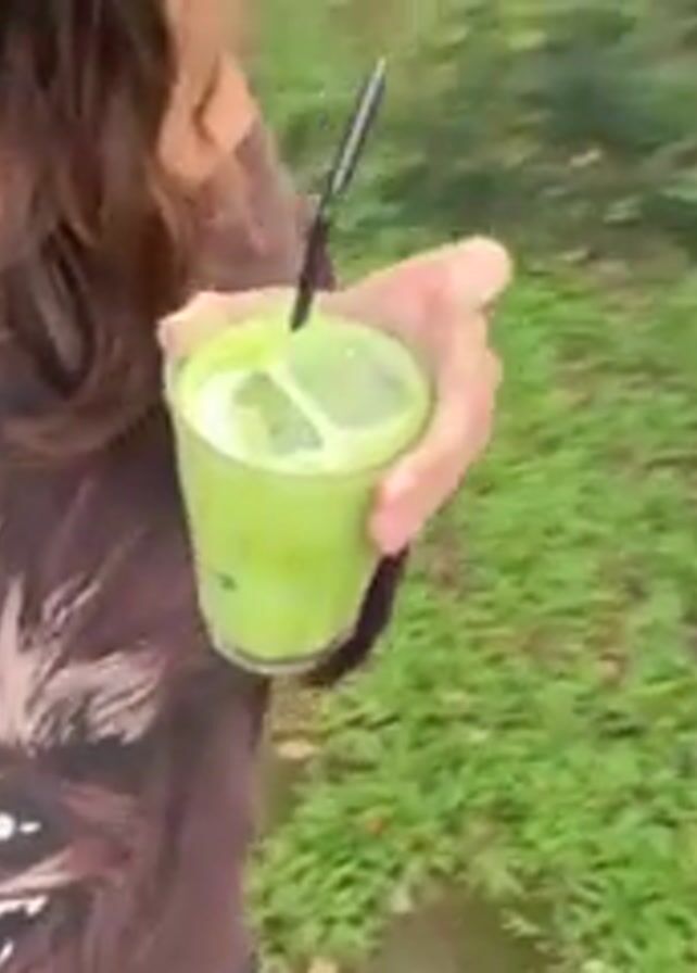 A woman is holding a clear plastic cup with a green drink and a black straw. She is wearing a brown, long-sleeved shirt with a graphic of Chewbacca. She is standing in a grassy outdoor area with various plants and a building in the background. The camera moves slightly as she walks.