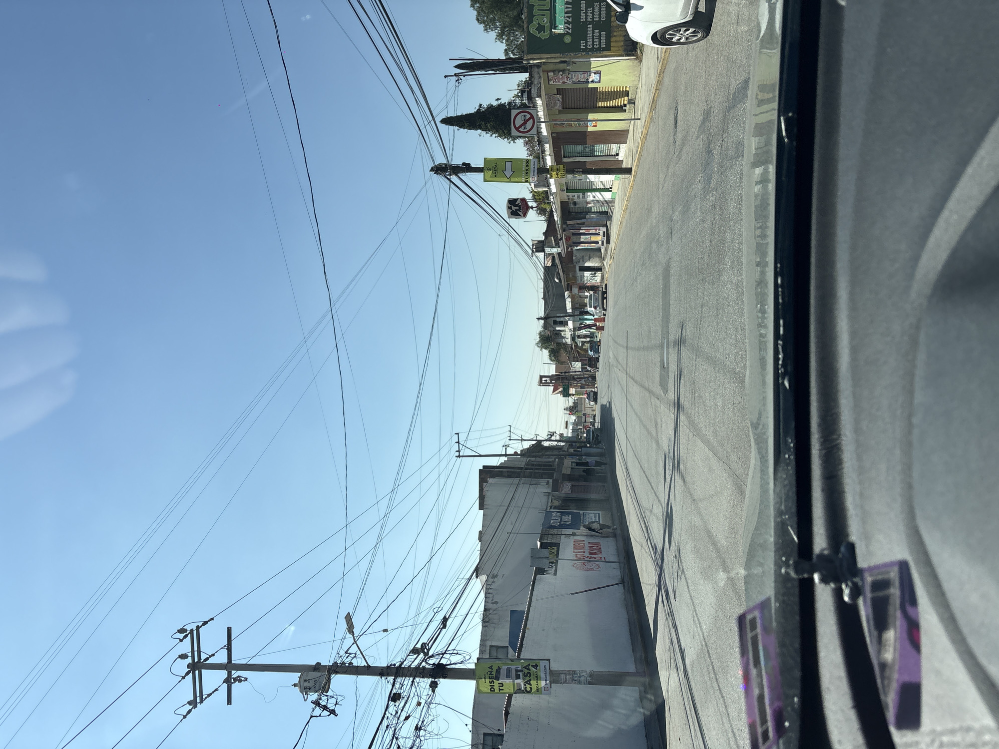 The image displays a street scene in San Juan Cuautlancingo, Mexico, viewed from inside a vehicle on a clear, sunny day. The foreground shows a dark dashboard with a small, dark figurine, possibly a Buddha, and blurry purple items. The paved street ahead exhibits tire marks and multiple manhole covers. Utility poles with a dense entanglement of overhead electrical and communication wires line both sides of the road. Buildings, primarily one to two stories, border the street, many featuring storefronts and commercial signage. On the left, a pole displays a green banner reading "DISEÑA TU CASA" and a sign stating "¡CUIDADO! EL HUERTO ES MEXICANO!". On the right, signs include a white one with a green arrow and "AMEYAL $1,199,000", a red circular "no smoking" symbol, and a green sign advertising recyclables such as "PET" and "Cobre". A white compact car is partially visible parked on the right sidewalk in the mid-ground. Two indistinct individuals are observed walking on the left sidewalk further down the street. Additional vehicles are present on the street in the distance. The sky is clear and blue.
