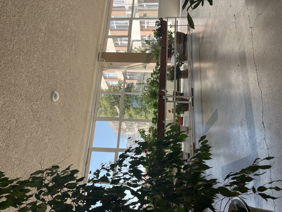 The image depicts an interior space, likely a hallway or common area, within a building in Plovdiv, Bulgaria, under bright daylight conditions
