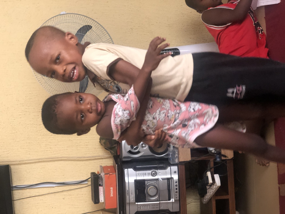 Two young children are in the foreground. The older child is carrying the younger one. Both are looking at the camera. The older child wears a tan shirt and black pants; the younger one wears a pink and white dress. Behind them is a standing fan and a shelf holding a stereo system and various other electronics. Another child in a red and white tank top sits in the background. The wall is a light yellowish color and a brown rug sits on the floor to the right.