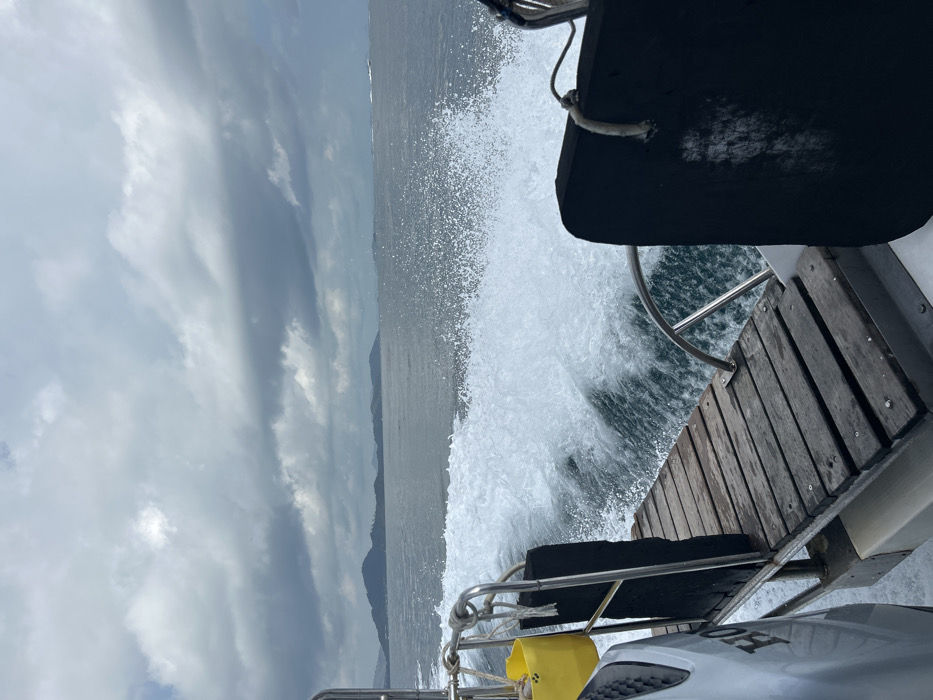 The image depicts a stern-view from a boat actively moving through a body of water. A substantial white wake trails directly behind the vessel, characterized by churning foam and spray. The boat's stern features a wooden slatted platform, framed by stainless steel railings. On the left side, a yellow bucket is suspended from a railing, adjacent to a visible portion of a white outboard motor with "HO" lettering. Black padded elements are present on both the left and right sides of the stern structure. The midground water is dark blue-green and appears choppy with dispersed whitecaps. In the distant background, a series of dark green, undulating landmasses or islands are visible beneath an overcast sky filled with dense grey clouds. No individuals are present. The scene is located on open water near land, city of Unknown, Unknown.